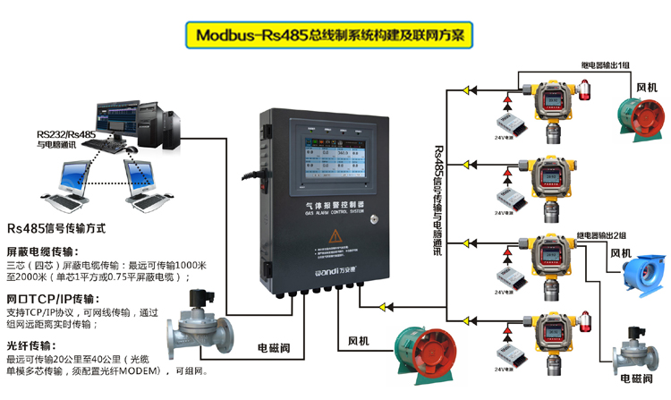 監測集成方案:依托氣體報警控制器實現多點位監測數據一機集成,觸摸屏操作系統菜單,巡檢主顯示屏顯示測量氣體濃度值、報警信息、故障信息、系統操作日志、各通道氣體所有參數信息(如氣體名稱,量程,報警值等。