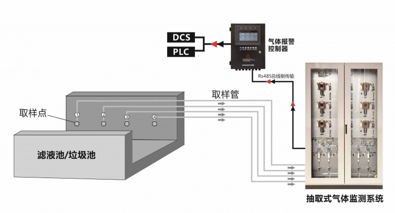 目前針對垃圾發(fā)電廠有毒氣體在線監(jiān)測方面的改進方案是采用多點抽取式,將每個監(jiān)測區(qū)域分幾個采樣點,將檢測儀表統(tǒng)一安裝于一個機柜里,安放在安全區(qū)域,每個采樣點到每臺檢測儀表各鋪設(shè)一根采樣管,通過間歇循環(huán)抽取實現(xiàn)多區(qū)域采樣,實現(xiàn)危險氣體在線監(jiān)測,監(jiān)測數(shù)據(jù)通過有線或無線形式傳輸至氣體報警控制器或監(jiān)控中心的PLC或DCS系統(tǒng),該方案具有自動抽取控制、氣體超限聲光報警、預(yù)處理系統(tǒng)等功能,后期維護校準(zhǔn)都很簡單,更能有效保障工作人員人身安全。