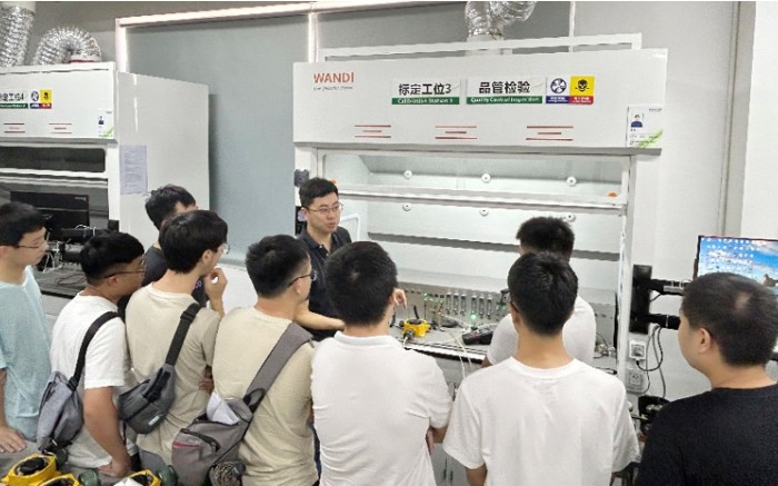 第二階段現場實操的教學中,在萬安迪專業的全自動標定車間里,許老師詳細講解氣體檢測儀器的原理、使用方法、校準方法等方面的專業知識。同時,還介紹了相關的計量標準和法規要求。